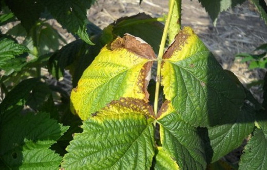 Листья малины желтеют и вянуть, верхушка увядает, побеги начинают медленно расти и стебли отмирают. При таком заболевании необходимо удалить малину вместе с корневой системой.